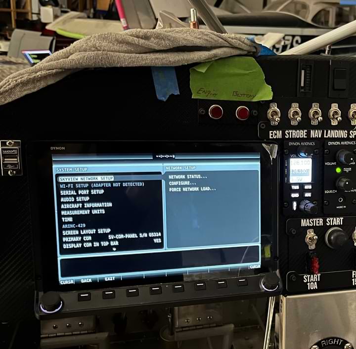 1.5 hr: Charlie, Samuel, Hope - Install last SkyView network cable. - Update SkyView software in the airplane. - Shorten seat cushion fastening screws in co-pilot seat pan. - Try to install copilot seat; strip nutplate; begin repairs. - Identify CAN wires; decide where to mount; not sure about ground wire. - Install COM antenna and cover for belly hatch. 1628 hr cummulative